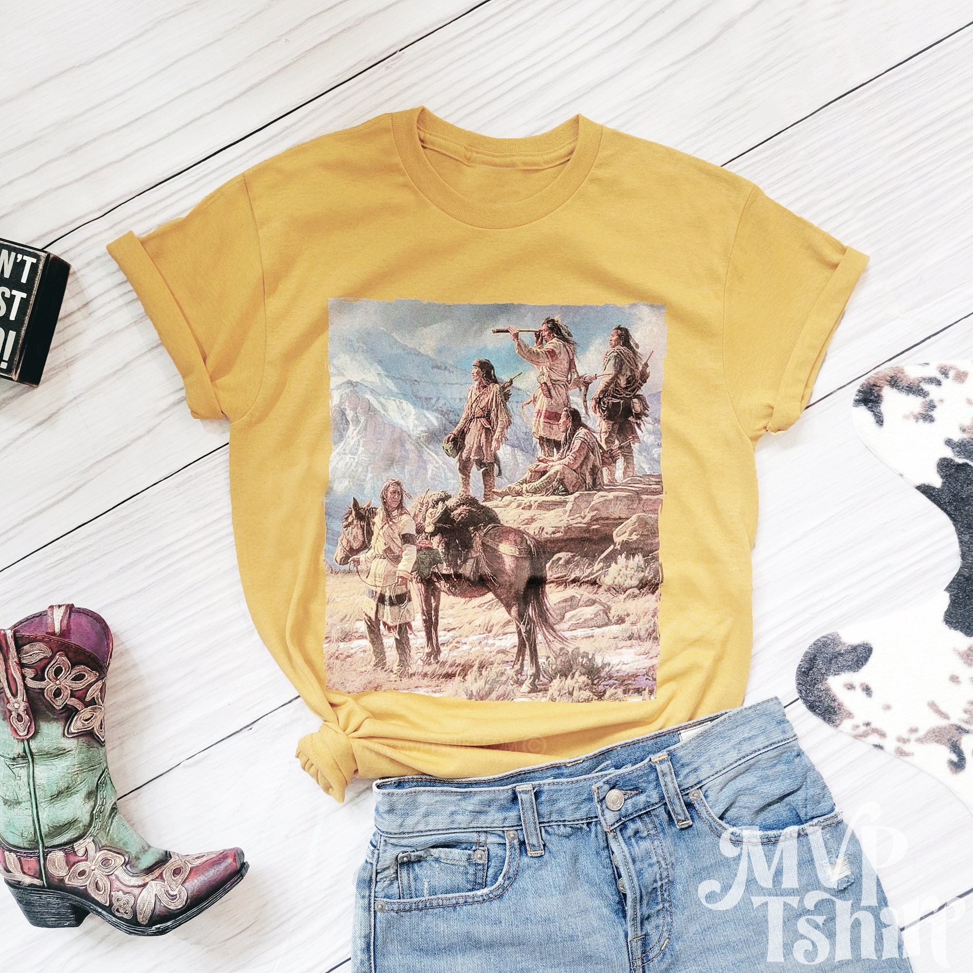 A vintage-style western art graphic tee inspired by classic frontier scenes.