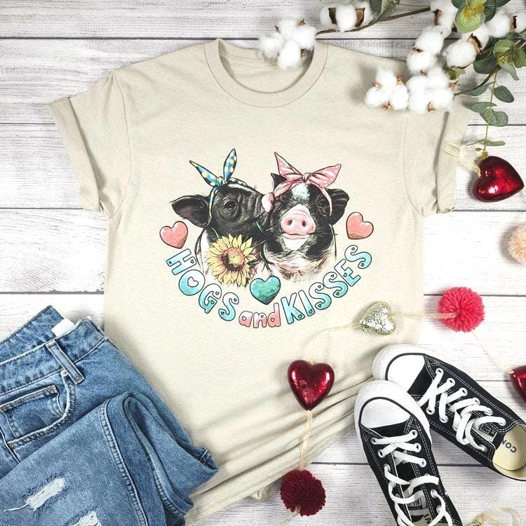 A cute southern graphic tee featuring an adorable “Hogs and Kisses” design. Perfect for farm lovers and casual everyday outfits.
