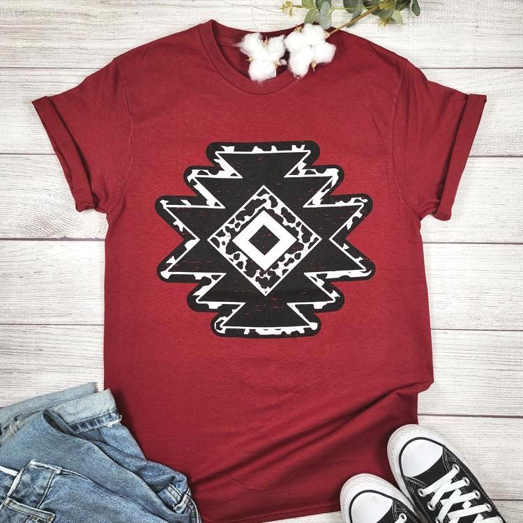A bold western Aztec graphic tee featuring a cow print–inspired pattern.