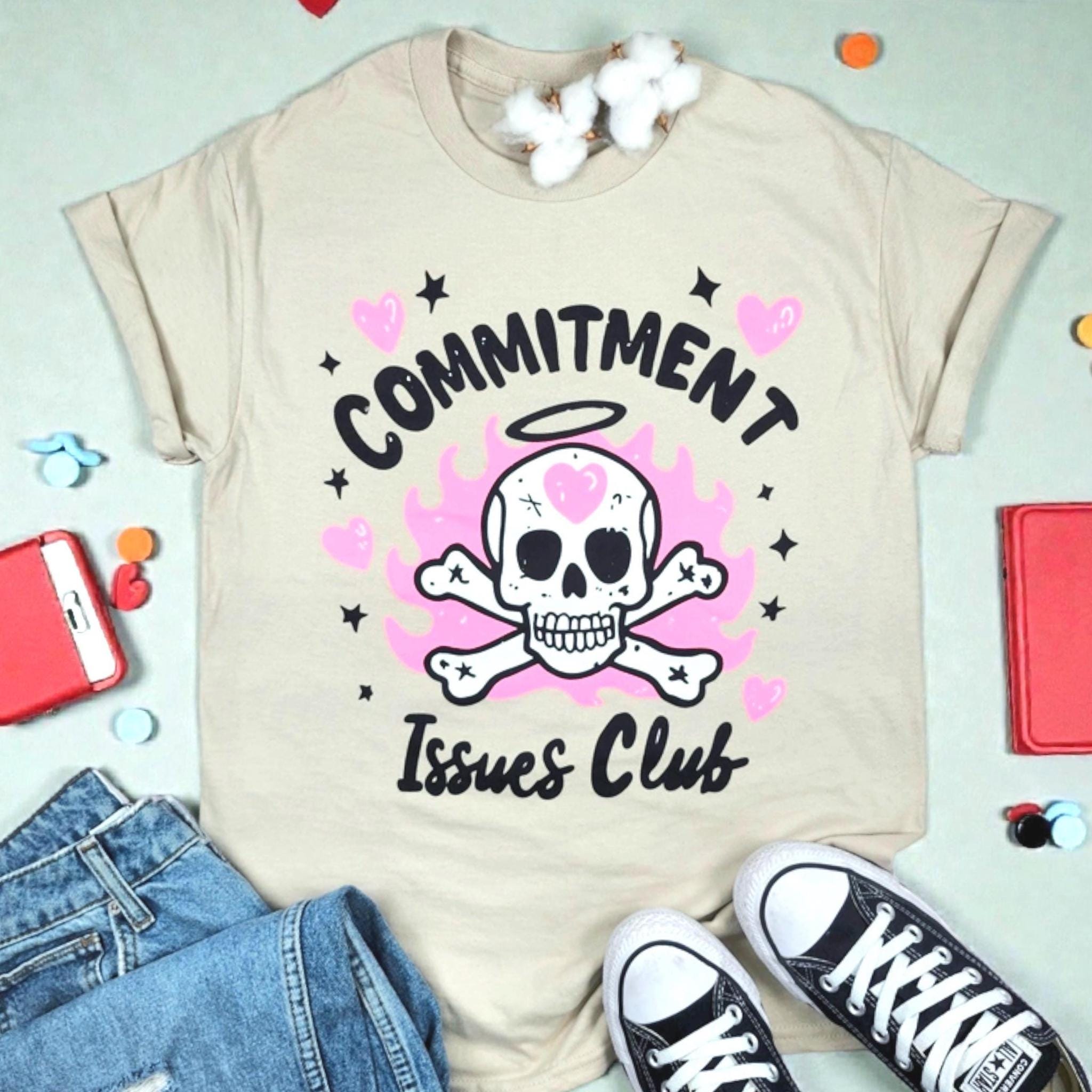 A playful graphic tee featuring a bold “Commitment Issues Club” design with fun, tongue-in-cheek attitude.