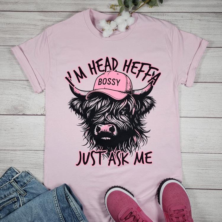 This funny cowgirl graphic t-shirt features the quote “I’m Head Heffa Just Ask Me.” A comfortable everyday tee with western humor and bold attitude.