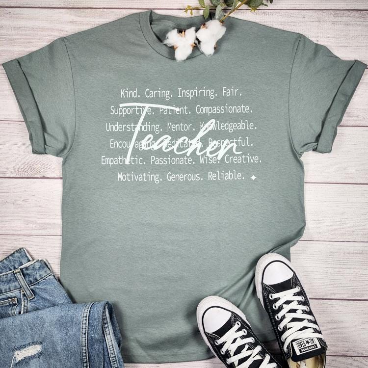 This teacher appreciation graphic t-shirt features a thoughtful list of inspiring qualities. A comfortable everyday tee made to celebrate caring and dedicated teachers.