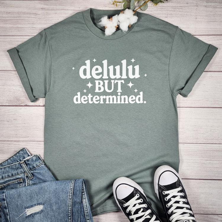 A trendy “Delulu But Determined” graphic tee for confident dreamers with unstoppable energy.